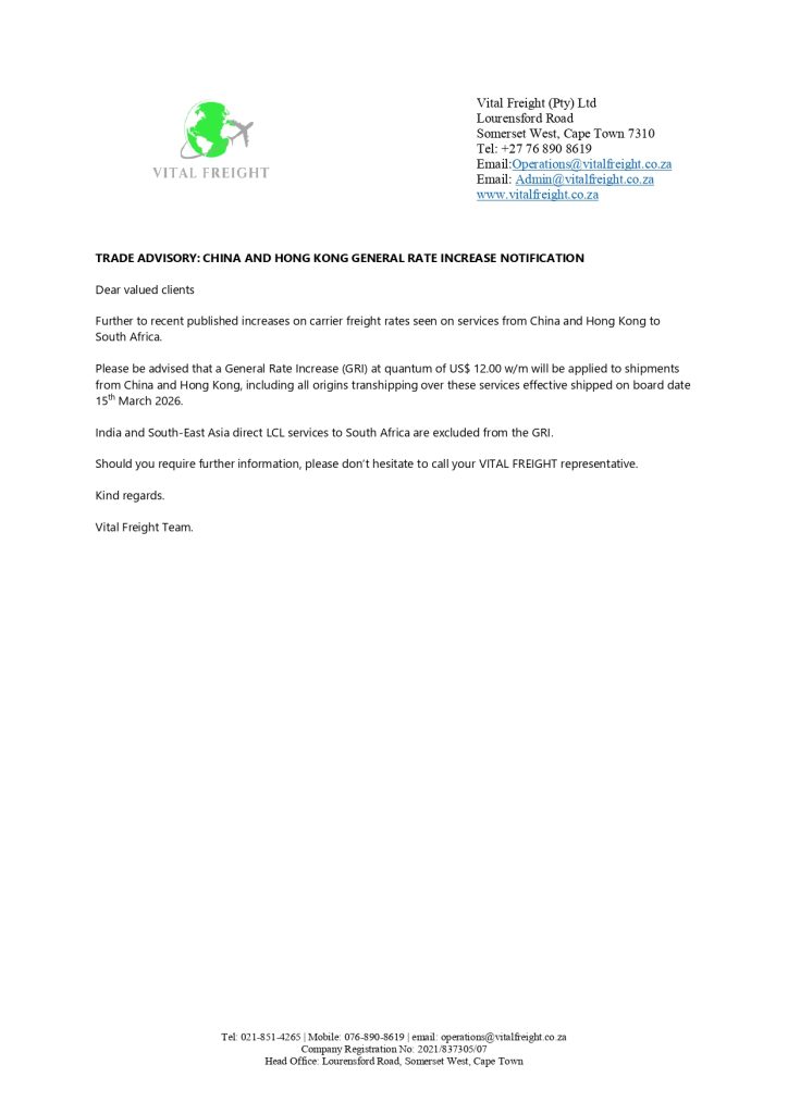 TRADE ADVISORY : CHINA AND HONG KONG GENERAL RATE INCREASE NOTIFICATION